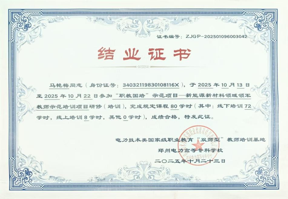 为加快“双师型”教师队伍建设,10月12日,我校选派智能与电气工程学院马艳梅老师赴郑州电力高等专科学校,参加教育部2025年“职教国培”示范项目——新能源新材料领域领军教师示范培训。