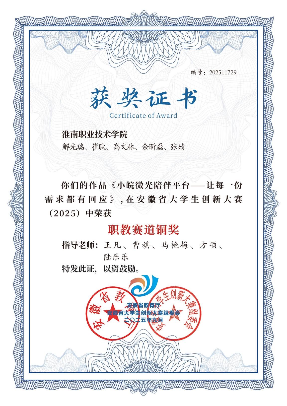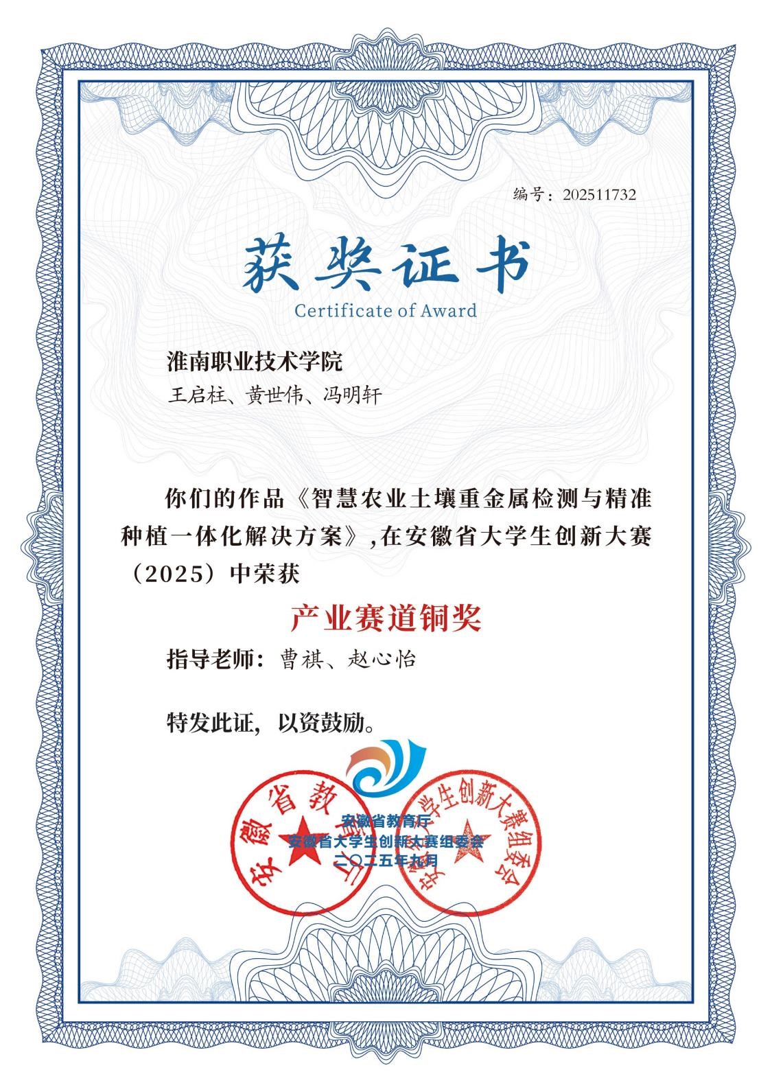 近日,安徽省大学生创新大赛圆满落幕,智能与电气工程学院学子凭借扎实专业素养与出色实践能力,在大赛激烈竞争中脱颖而出,分别于职教赛道和产业赛道斩获铜奖。安徽省大学生创新大赛前身为安徽省“互联网+”大学生创新创业大赛,是由安徽省教育厅主导的年度性大型赛事,本届大赛吸引了19.8万个项目报名参赛,参赛人数达80万,旨在激发青年学生创新创造热情,提高学生的创新精神、创新意识和创新能力。