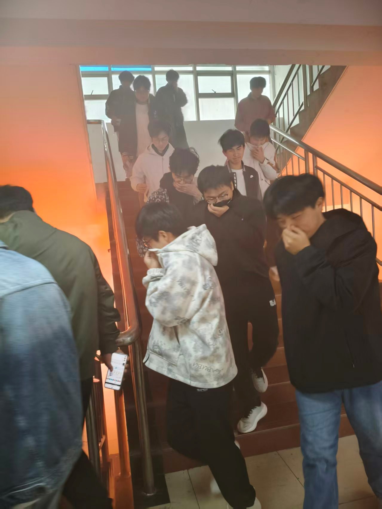 随着3区男生宿舍楼演练开始的信号发出,3区宿舍内演练现场模拟了火灾突发的情况。智能与电气工程学院的师生从4至5层迅速启动应急疏散预案,按照预定疏散通道用湿毛巾捂住口鼻有序撤离。在疏散过程中,同学们保持队形整齐,确保每个人都能安全撤离。演练结束后,3区男生全部成功疏散并到指定地点集结并进行灭火演练。
