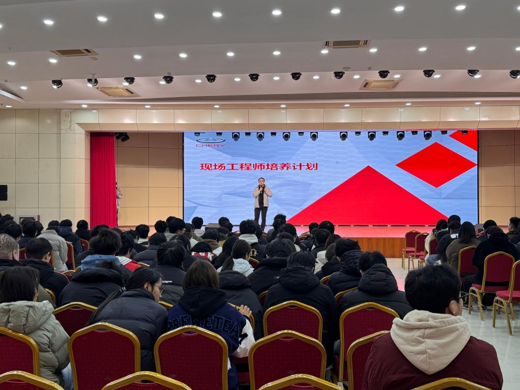 为深化产教融合、搭建校企协同育人平台,助力学生精准对接行业需求、明晰职业发展方向,2025年12月23日下午,奇瑞汽车股份有限公司校企合作宣讲会在淮南职业技术学院春申湖校区大礼堂成功举办。智能与电气工程学院24级电气自动化技术专业、24级工业机器人技术专业共计298名学生参加此次宣讲活动,学院相关负责人陪同参会。